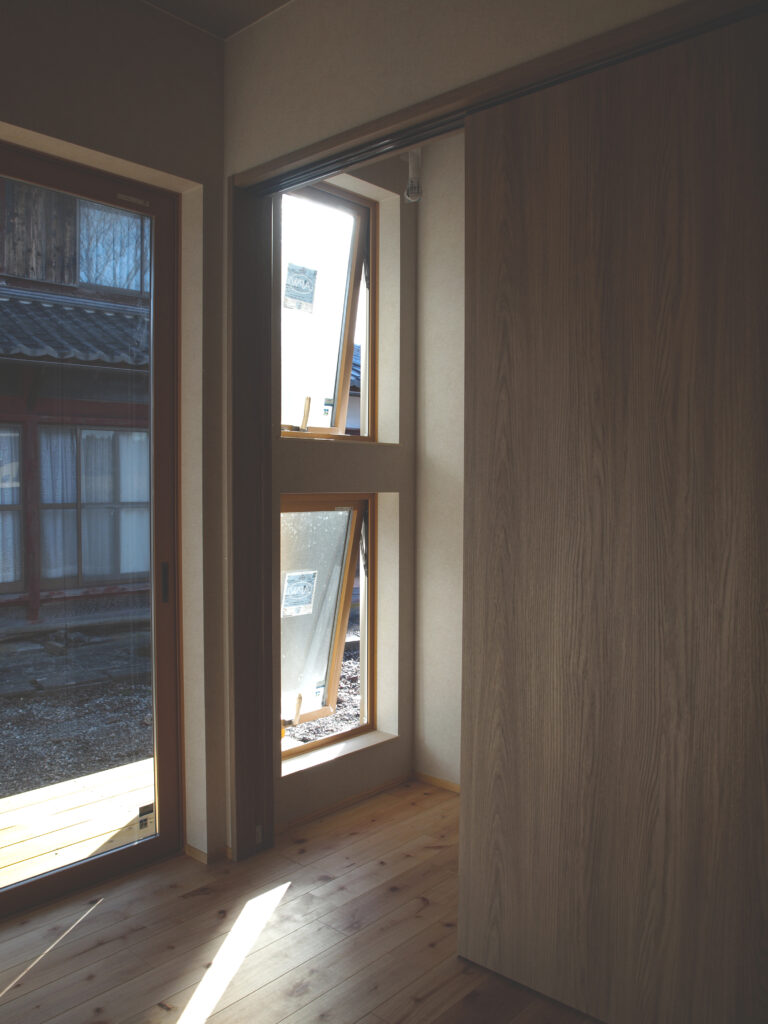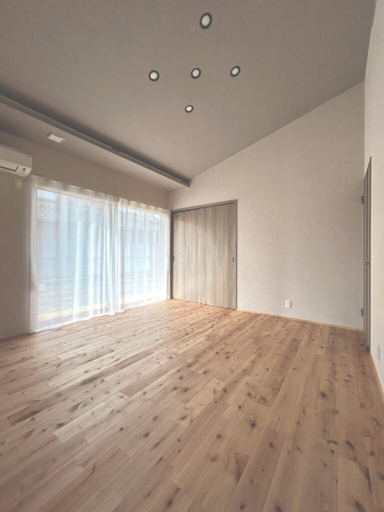 勾配天井にすることで、空間に開放感をつくっていく。